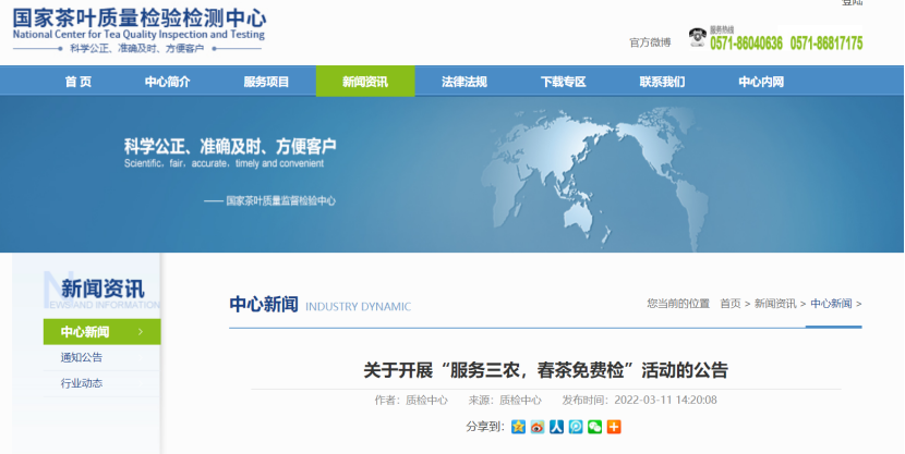 为助力全国春茶生产加工销售,各地有关机构大力改善服务。国家茶叶质量检验检测中心开展“服务三农,春茶免费检”活动,活动时间为2022年3月11日-6月30日。免费为广大茶企、茶农提供总计100批次样品的感官品质检验检测服务。3月以来,全国茶叶主产区进入采摘期,茶农也迎来今年第一茬收获,茶的食品安全也会影响茶企、茶农收入。