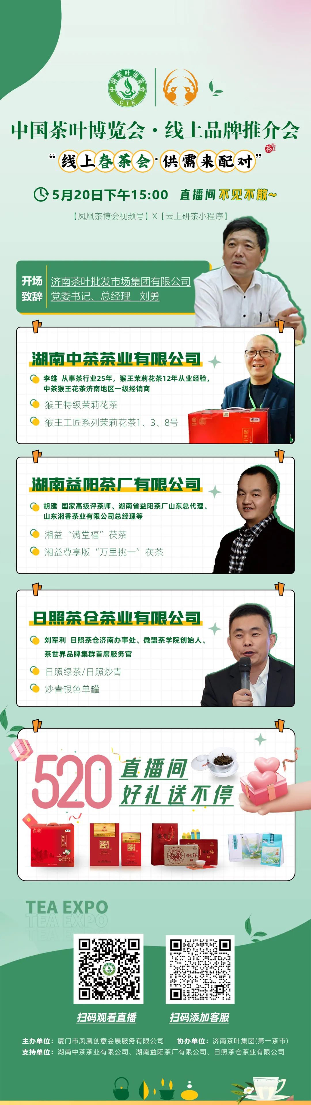 谷雨之后,茶叶市场开始迎来了春茶销售季,但是受到疫情的影响,整体的市场依旧相对低迷。为帮助企业解决“茶难卖”困境,为广大茶企和采购商搭建一个更快速、便捷、高效的供需对接平台。中国茶叶博览会组委会特别企划了“中国茶叶博览会线上品牌推荐会”,帮助企业提升品牌影响力和产品认知度;打破地域和疫情限制,帮助厂家和经销商实现实时供需对接,助力企业招商拓客,提升春茶产品销量。